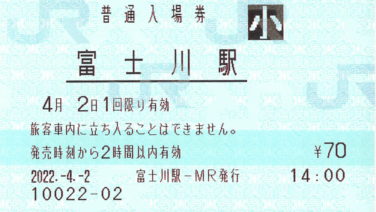 駅めぐり 富士川駅 入場券駅スタンプなし駅舎改札前・出札窓口前その他駅名標富士川駅の駅舎奥に富士山が見えましたコメント東海道本線 富士川駅の入場券です。駅スタンプはなし。駅は冨士川を渡った西側に位置します。駅舎は国鉄っぽいですね。また、富士山がよく見えたので、... 2022.12.08 駅めぐり